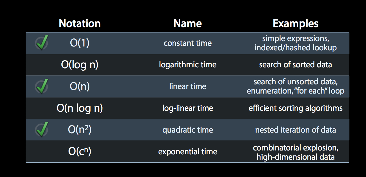 - containsObject:,containsObject:,indexOfObject*,removeObject: 会遍历里面元素查看是否与之匹对,所以复杂度等于或大于 O(n)